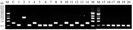 Analysis of colony PCR products by DNA gel electrophoresis. M: 1 kb DNA ladder; C: control (pCDFDeut-FRT as template); 1–14: sample trials. Negative results: 756 bp (Lanes C, 4, 8, 10, 12, 14). pGRN02: 1620 bp (Lane 2). Unknown product: 500 bp (Lanes 1, 3, 5–7, 9, 11, 13, 15–20).