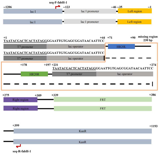 To obtain more insight into the side reaction, the 500 bp colony-PCR product was isolated and subjected to DNA sequencing. Upon aligning this 500 bp sequence with the vector pCDFDuet-FRT sequence (Figure S1), we observed that the sequence between the two PT7-lacO regions in the vector was deleted in the 500 bp sequence (the deletion was 44 bp long and thus was named HR44 in this study) (Figure 2), forming an unexpected circular recombinant plasmid that we named p500 (refer to Discussion for further details).