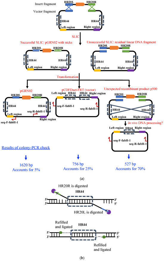 Proposed mechanism for the formation of pGRN02 and the major by-product p500. (a) Expected SLIC assembly generates pGRN02 after exonuclease processing of HR20L and HR20R followed by annealing, gap filling, and ligation. However, annealing between the internal homologous HR44 sequences promotes formation of the truncated recombinant plasmid p500. (b) After HR44 pairing, in vivo exonucleases remove the remaining non-paired HR20L and HR20R overhangs, followed by gap filling and ligation to yield the circular plasmid p500.