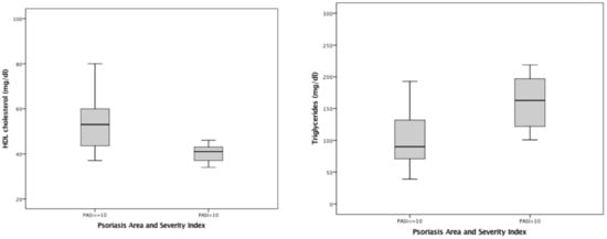 In order to estimate an association between psoriasis activity and cardiovascular risk, two subgroups of psoriatic patients were defined, considering that PASI ≤ 10 accounts for mild activity and PASI > 10 includes both moderate to severe disease activity [].