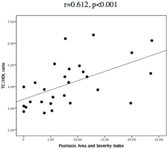 Graph showing association between total cholesterol/HDL ratio and psoriasis severity (estimated by PASI); Pearson’s correlation used; significance level defined at p ≤ 0.05.