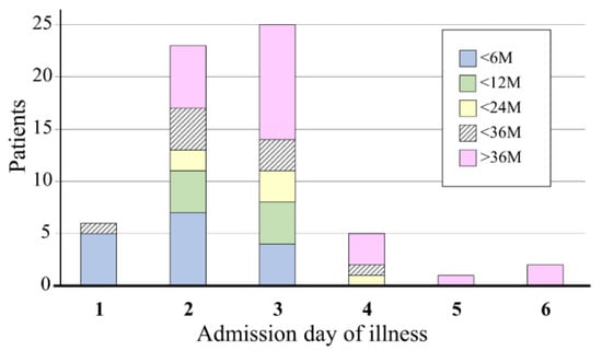 The relationship between the admission day of illness and patient age is shown in Figure 1. All subjects were admitted before the seventh day of illness. The median (interquartile range (IQR)) admission day of illness was day 3 (2,3), and 54 patients (87%) were admitted within the third day of illness. Of the patients admitted within the third day of illness, 44% patients were infants, and all infants were admitted within the third day of illness. Of the patients admitted after the third day of illness, 75% patients were ≥3 years old.