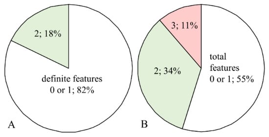 Proportion of clinical features of Kawasaki disease at admission. (A) Proportion of patients with each number of definite features. (B) Proportion of patients with each number of total features. For definite features, 82% patients presented with one or no definite features and 18% of patients presented with two definite features. For total features, 89% of patients presented with one or two features at admission.