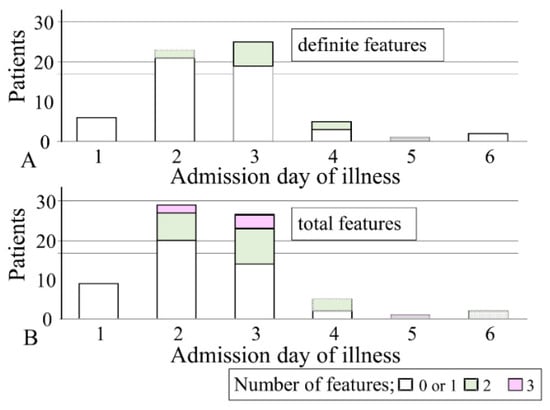 Number of clinical features of Kawasaki disease at admission and the admission day of illness. (A) Number of definite features and (B) number of total features. Among patients who were admitted within the third day of illness, many patients presented with one or no clinical features (definite features, 85%; total features, 59%). Among eight patients admitted after the third day of illness, the proportion of patients who presented with one or no features decreased to 63% for definite features and 25% for total features.