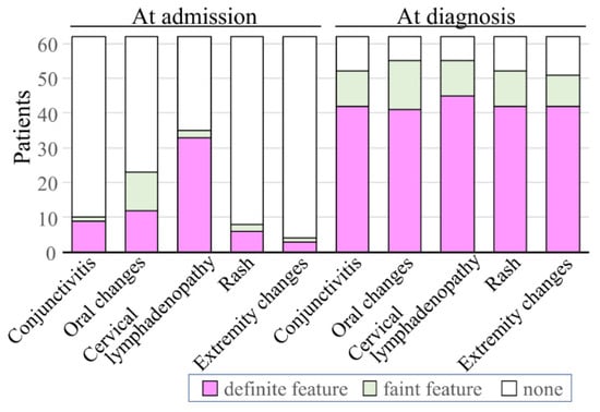 Among the d-Features at admission, cervical lymphadenopathy was the most common (53%), followed by oral changes (19%) and conjunctivitis (15%) (Figure 4). Rash or extremity changes were rarely observed as a d-Feature (3% and 2%, respectively). Most f-Features were rarely observed (2–6%), except for oral changes (18%) (Figure 4). The number of d-Features at admission among each initial diagnosis was not different when lymphadenopathy was excluded.