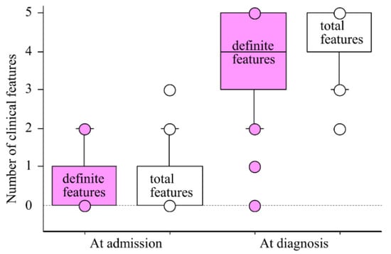 Number of clinical features at admission and diagnosis. The number of clinical features at admission were minimal (definite features, 1 (0–1); total features, 1 (1–2)). Two days later, the number increased and diagnoses of Kawasaki disease were established (definite features,4 (3–5); total features, 5 (4–5)). Number of features are expressed as the median (interquartile ranges).