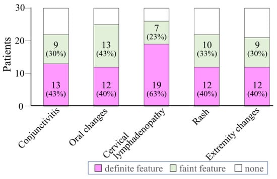Proportion of clinical features in patients who presented with ≤3 definite features at diagnosis. Among 30 patients who presented with ≤3 definite features at diagnosis, cervical lymphadenopathy accounted for 63% of definite features, whereas other features accounted for around 40%. Oral changes account for 43% of faint features, whereas conjunctivitis, rash, or extremity changes accounted for around 30%.