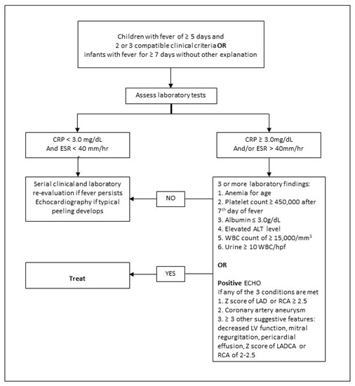 - McCrindle, B.W.; Rowley, A.H.; Newburger, J.W.; Burns, J.C.; Bolger, A.F.; Gewitz, M.; Baker, A.L.; Jackson, M.A.; Takahashi, M.; Shah, P.B.; et al. Diagnosis, Treatment, and Long-Term Management of Kawasaki Disease: A Scientific Statement for Health Professionals from the American Heart Association. Circulation 2017, 135, e927–e999. [Google Scholar] [CrossRef]