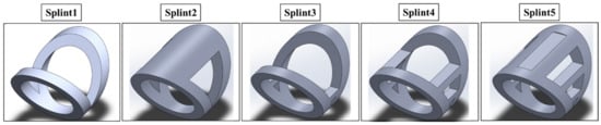 In Figure 3, the five splint designs that were tested computationally for optimal rigidity are shown. These models of the splints shown were designed using the 3D modeling CAD software Solidworks. Each design consisted of a different structure and number of bars, generating different degrees of rigidity. The angulations between the two elliptical designs were based on the measurements of the subjects. The splints consisted of elliptical shapes, which were generated as per the measurements. These splints were designed keeping in mind the aim of realigning the finger joints to correct the deformities. The design extended from mid proximal phalange to mid distal phalange. Depending upon the bending restriction and for enhancing the overall structural strength, five designs were drafted by adding different types of bars. The angulation between the ellipses was calculated with the measurements, and the ellipses were assembled accordingly. These designs were then further tested using finite element methods (FEM).