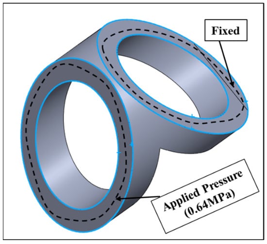A structural analysis module was used to evaluate the various designs of splints in ANSYS Workbench (ANSYS Inc. Southpointe, 275 Technology Drive, Canonsburg, PA, USA). Standard parameters were used to determine the mechanical properties of PLA using Type I ASTM D638 test standards, such as Young’s modulus, the thickness of the layer, Poisson’s ratio, and the width of the raster [19,20]. The material properties of all splints were defined in terms of Poisson’s ratio of 0.25 and Young’s modulus of 2850 MPa [10]. A maximum pressure of 0.64 MPa was applied on one of the boundaries, keeping the other boundary fixed (Figure 4). Figure 4 illustrates the load and boundary conditions applied to perform the computational finite element modeling. A pressure of 0.64 MPa was applied by keeping one end of the splint fixed. These pressure conditions depict the actual loading conditions observed due to the bending of the fingers while wearing such types of splints [10]. These boundary conditions depict the actual loading conditions observed due to the bending of the fingers while wearing such types of splints.