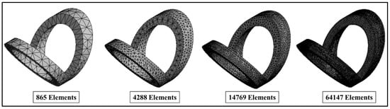 Figure 5 illustrates a gold standard mesh convergence study which is used to determine an optimal mesh with high accuracy for computational simulations. For the accuracy and precision of the computational model, five different types of meshes with elements in regular intervals, namely very coarse (865 elements), coarse (4288 elements), fine (14,769 elements), and superfine (64,147 elements) models, were used (Figure 5), similar to previous studies [21,22,23]. The mesh which produced stress values within the 5% error, as compared to adjacent meshes, will be considered the optimal mesh.