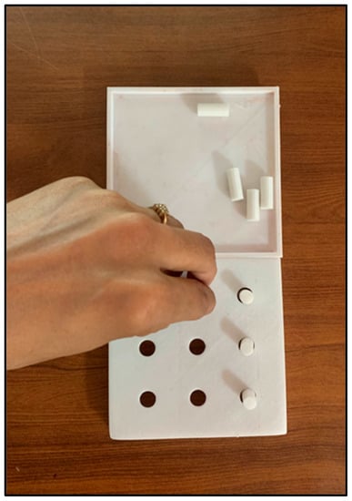 The study used two measures to estimate the performance of the 3D-printed finger splint. The first assessment was through a questionnaire QUEST 2.0 (Quebec User Evaluation of Satisfaction with Assistive Technology) [27]. It is a 12-item instrumentation that is used to evaluate the performance of any assistive technology by asking several questions to the user to assess the characteristics of the assistive device used and the service provided for the follow-up. The second assessment was an objective assessment using the Nine Hole Peg Test (NHPT) that aims to measure the finger dexterity of the affected patients [28]. The score in this test is administered depending upon the time taken by the patient to place the pegs into the holes present on the board (Figure 6). The time starts as soon as the subject touches the first peg and ends at the placement of the last peg. The measurements were taken with and without the splints. Both quantitative measurements were used to analyze the data obtained from the patient’s response.