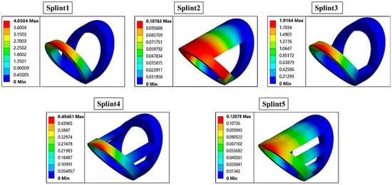 The total deformation analysis of designed splints is shown in Figure 8. The maximum and minimum deformation was observed in splint 1 (4.05 mm) and splint 2 (0.10 mm). The deformation values of other splints lay between splint 1 and splint 2, respectively. The deformation values of splint 2 and splint 5 showed similar values, i.e., 0.10 mm ± 5%. Overall, amongst all splints, splint 2 and splint 5 showed the minimum deformation, thus, indicating that these splints could perform well under a standard deformation value.