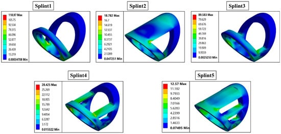 Since there were fewer differences seen in the deformation values, the stress analysis was also performed. The total von-Mises stress of designed splints is illustrated in Figure 9. The maximum and minimum stress were induced in splint 1 (118.97 MPa) and splint 5 (12.57 MPa), respectively.