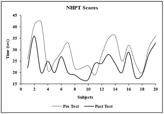 The improvements in the NHPT scores were approximately the same, with a maximum difference of 22 s to a minimum improvement of two seconds. There were two subjects whose NHPT scores were higher with splints rather than without. However, the differences in the scores were small.
