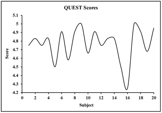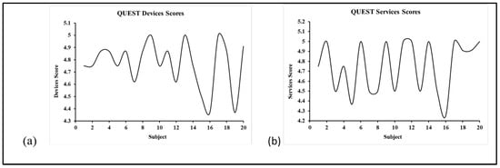 The scores assessed through this questionnaire were calculated using paired sample test in SPSS software. The scores obtained were under two categories, i.e., devices and services scores. The quantified value for the devices section was 4.76 ± 0.04 (Figure 12a), and for the services section was 4.74 ± 0.06 (Figure 12b); both the values were at p-value ˃ 0.005. The total scores obtained were 4.75 ± 0.04 (Figure 13) at a confidence interval of 95% and p-value ˃ 0.005. The questionnaire also had a subsection of 12 categories, out of which the subjects had to decide the three most satisfactory categories. The top three selections in aggregate were weight, ease to use, and effectiveness.