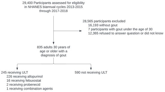 This observational cohort study used data from the National Health and Nutrition Examination Survey (NHANES). NHANES is a cross-sectional prospective continuous health survey that aims to assess the health and nutrition of the noninstitutionalized civilian population in the United States. NHANES conducts at-home health interviews and physical examinations at mobile centers. Questionnaire, laboratory, and physical examination data are available in 2-year survey waves. Data from the NHANES survey waves of 2013–2014, 2015–2016, and 2017–2018 were combined in this study. We included adults who were 30 years or older and who had answered ‘yes’ when being asked whether a doctor had told him/her that they had gout. The participant selection process is summarized in Figure 1. All data used in the study is publicly available and deidentified, and no institutional review board approval was required (45 CFR §46.102(f)).