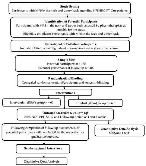 The research design for this study is both quantitative and qualitative. A double-blind RCT with a pragmatic approach will be used as the quantitative study; it will precede the semi-structured interviews that will be used for the qualitative study. This is because the RCT design is capable of detecting clinically important outcomes such as myofascial pain, while the qualitative approach will enable in-depth and rich data to be gathered concerning the patient’s experience Morgan (1993) [24]. This study adopted the priority sequence approach for mixed methods design suggested by Morgan (1993) [24] as the research methodology. This means that a principally quantitative approach will be complemented by a qualitative study using semi-structured qualitative interviews. The qualitative method will serve as a follow-up to the quantitative approach. This study will have two phases. Phase 1 will involve an RCT and phase 2 will be a qualitative study using semi-structured interview. The flow chart for the research design is summarised in Figure 1.