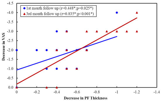 In our study, in the patients treated with CSI followed by TUS, there was a significant positive correlation between the decrease in plantar fascia thickness and pain VAS improvement at both follow-up visits and also between the decrease in plantar fascia thickness and PFPDS improvement. This is in agreement with Moustafa et al., who found significant positive correlations between plantar fascia thickness after CSI with pain VAS score before and after treatment (p < 0.05) [26].