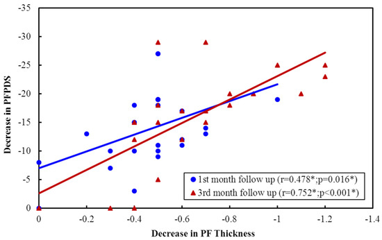 Correlation between decreases in PF thickness with the decrease in PFPDS in ESWT Group.