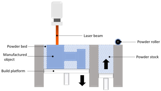 Based on the classification put forth by the American Society for Testing and Materials (ASTM), metal AM has four main subcategories, namely, powder bed fusion (PBF), directed energy deposition (DED), binder jetting (BJ), and sheet lamination [5]. Among all these subcategories, DED and PBF are the most proven and feasible methods for metals [6]. In DED, the energy source and the material feeding nozzles are focused at the deposition site [7]. The feeding nozzles provide the material in the form of wire or powder, and the energy source melts the material on the surface of the deposit site creating a small melt pool. In PBF, a coating roller spreads out the powder on the building platform [8]. An energy source selectively melts the top few layers of the powder. Once the upper layers are fused and solidified, the build platform is lowered for the next coating of powder. In PBF, two different energy sources can be implemented, such as, a laser or an electron beam. The laser-based powder bed fusion (L-PBF) is a popular PBF process that has shown remarkable capabilities in processing AlSi10Mg. In L-PBF, a thin layer of powder is selectively melted and consolidated by using a high-energy laser beam, as shown in Figure 1. Printing parameters, such as the scan pattern [9], laser power [10], scanning speed [11], hatch spacing [12], layer thickness [10], build orientation [13,14], and built plate temperature [15] are typically varied to produce parts with the desired characteristics, such as surface quality [9,10], porosity [16,17], dimensional accuracy [18,19], microstructures (e.g., columnar vs. equiaxed grain) [20,21,22], and properties (e.g., mechanical [23,24,25], hardness [26,27,28], corrosion [11,29], and oxidation [13,30,31]).