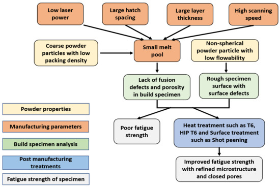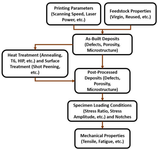 Among different alloys that have been successfully processed using L-PBF, a significant volume of work exists with AlSi10Mg [15,32,33]. In AM, the feedstock (e.g., virgin vs. recycled, etc.) and the printing parameters (e.g., high vs. low cooling rates, etc.) dictate the as-built deposit properties (e.g., pores, microstructures, anisotropy, etc.). These properties affect the heat treatment response and the mechanical properties (e.g., tensile, fatigue, etc.) of the final part (Figure 2). To advance the fundamental linkages among all these critical steps (Figure 2), this article aims to present an overview of how fatigue properties of the L-PBF-fabricated AlSi10Mg specimens are affected by the feedstock properties, printing parameters, specimen geometries, and post-processing treatments. Both ex-situ and in-situ experimental approaches are discussed in details. Thereafter, the article summarizes the state-of-the-art computational modeling results that are crucial in developing predictive capability.
