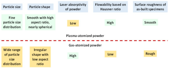 The plasma-atomized powders were found to be more spherical compared to the gas-atomized powders. The gas-atomized powders had oxide inclusions and satellite attachments on their surfaces, whereas the plasma-atomized powders were smooth and did not have any oxide inclusions or satellites. Particles below 10 µm diameter were found in the plasma-atomized powders, however, the gas-atomized powder had a particle size distribution range of 10 µm to 100 µm. Dynamic image analysis revealed that the plasma-atomized powder had a higher aspect ratio approaching an ideal spherical shape, unlike the gas-atomized powder. The plasma-atomized powder also possessed a lower Hausner ratio indicating improved flowability. The presence of spherical particles increased the packing density. Hence, both bulk and tap density of the powder increased. The laser power absorption was found to improve due to the presence of fine particles in the plasma-atomized powder. The particle shape also affected the laser power absorption. Non-spherical particles showed a higher laser power absorption coefficient indicating that the gas-atomized powder with a fine particle size distribution and irregular shapes would result in high laser power absorption. An overview of the properties of the plasma-atomized and gas-atomized powders is presented in Figure 3.