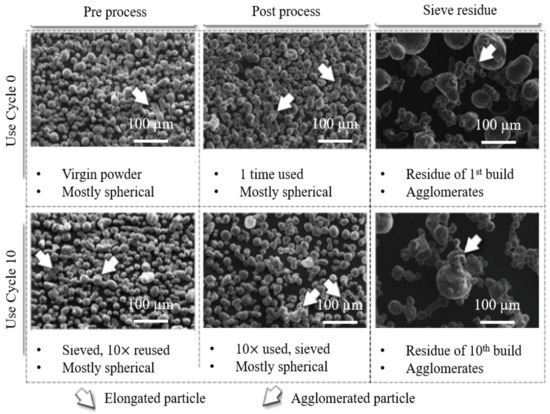 Impact of Powder Reuse: Powders are often recycled in L-PBF to reduce the cost of manufacturing. With an increase in the number of reuse cycle, the oxygen content in the powder increases. The shape of the recycled powder particles shows deformation during L-PBF as they start to agglomerate. The recycled powder also shows satellites. Moreover, there is a loss of fine particles with an increase in the number of reuse cycles because the powder particles are sintered during the L-PBF process [51]. Representative SEM images of the virgin and recycled powders are shown in Figure 5. Tradowsky et al. reported that the pore area increased with the number of reuse cycle. The virgin powder had 0.26% pore area, whereas the reused powder showed 2% pore area [52].
