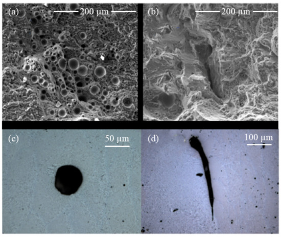 (a,c) Representative gas porosities. (b,d) Lack of fusion porosities. Reprinted with permission from Ref. [71]. Copyright 2020 Elsevier.
