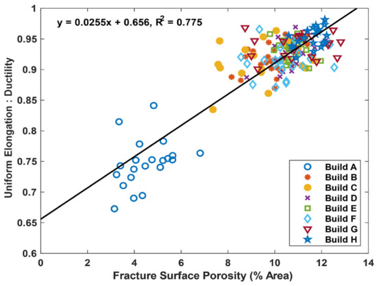 Ratio of uniform elongation to ductility as a function of fracture surface porosity. Build A was produced with fresh powders. Builds B through E were produced with recycled powders where the number of reuse cycle was varied from 1 to 4, respectively. In Build F, the machine was filled with new powder that had been stored for several weeks in an argon environment. Builds G and H were produced with recycled powder where the number of reuse cycle was varied from 1 to 2 starting from F. Reprinted with permission from Ref. [72]. Copyright 2020 Elsevier.