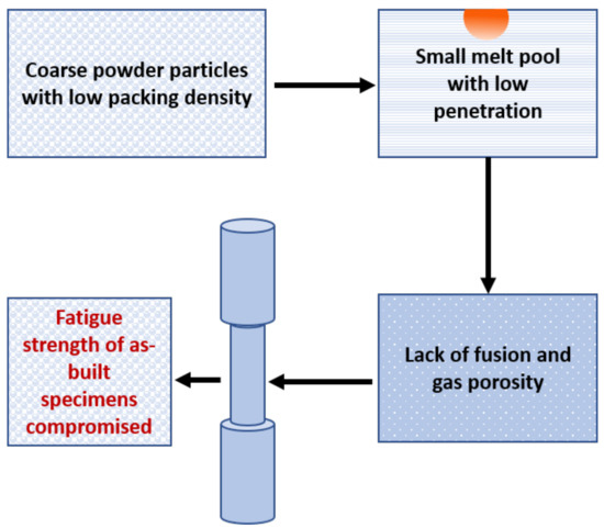 Brandao et al. correlated the fatigue properties of AlSi10Mg specimens with the layer thickness and build orientation [79]. Horizontal and vertical build orientations were selected, and for each orientation, specimens were built with two different layer thicknesses, e.g., 30 µm and 90 µm. The specimens built with 30 µm layer thickness consisted of a smaller number of pores compared with the specimens built with 90 µm layer thickness. A larger layer thickness implies a lower energy density which causes lack-of-fusion porosities. These pores within the layers act as imperfections giving rise to stress concentrations, which reduce the fatigue strength of the specimens. Hence, the specimens built with 30 µm layer thickness showed a higher fatigue strength than the specimens built with 90 µm layer thickness [79].