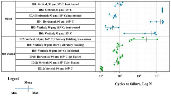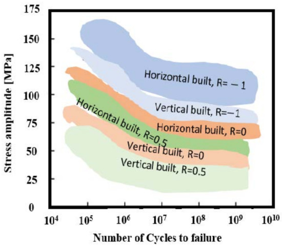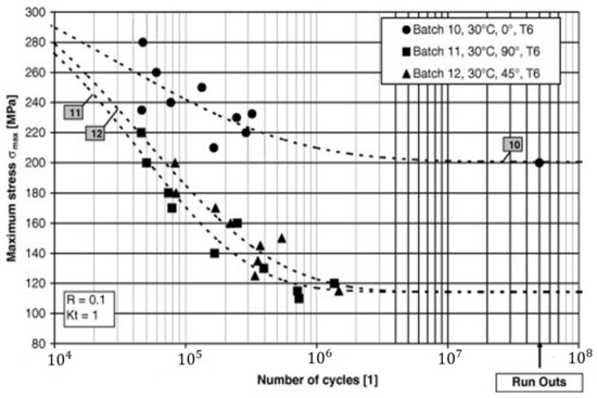 Impact of contour and build direction on the fatigue resistance of AlSi10Mg. Fatigue testing was conducted at a stress amplitude of 120 MPa and with a stress ratio of . Reprinted/adapted with permission from Ref. [82]. Copyright 2018 Elsevier.