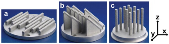 Brandl et al. investigated the fatigue properties of several AlSi10Mg specimens having build directions of 0°, 45°, and 90°, as shown in Figure 13. Two different build platform temperatures, i.e., 30 °C and 300 °C, were used in conjunction with a peak-hardening procedure for a handful of specimens once they were built [15]. The results showed that the peak-hardening process increased the fatigue resistance of the specimens built along the 0° direction compared to the other two build directions for the build platform temperature of 30 °C (Figure 14). However, when the build platform was at 300 °C, the peak hardening process significantly increased the fatigue resistance of specimens built along the 45°, and 90° directions. The specimens without peak hardening showed the lowest fatigue strength. The pores in the specimens built along the 45° and 90° directions were not parallel to the stress direction. These pores, therefore, gave rise to stress concentrations.