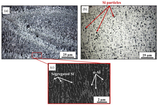 Impact of Post-Processing: Fite et al. investigated the impact of solution treatment on the microstructure of AlSi10Mg specimens [59]. The solution heat treatment at 530 °C was found to disband the eutectic ribbons and facilitate the formation of microscale Si precipitates. Takata et al. compared the as-built, annealed, and solution heat-treated microstructures of AlSi10Mg specimens [60]. The as-built specimens showed a characteristic half-cylindrical melt pool shape like other works [61,62,63]. The specimens also showed columnar Al grains in the melt pool. Annealing at 300 °C for 2 h made the Si particles coarser in some parts. Fine Si particles were found to be within the columnar Al grains implying that the Si phase precipitated within the Al matrix during annealing. However, after the solution treatment at 530 °C for 6 h, the melt pool boundaries were not visible via an optical microscope. The Si particles also became significantly coarser. The solution treatment caused the formation of Fe intermetallic phases with a rod-shaped morphology. The coarsening of Si particles was also observed in the AlSi10Mg specimens subjected to hot isostatic pressing (HIP) [64]. A relatively longer holding time at 530 °C allowed more diffusion of the Si particles making them less abundant.