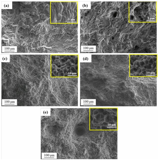 Fracture surfaces of specimens built in the horizontal direction: (a) as-built, (b) annealed, and after (c) HP + T6, (d) HIP + T6, and (e) T6 treatment. The magnified images are provided in the yellow boxes located at the top right corner. Reprinted with permission from Ref. [64]. Copyright 2020 Springer Nature.