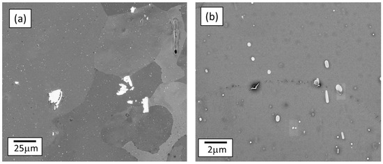 BSE imaging mode microstructure of AA6156 in T4 condition: (a) low magnification, showing large constituent particles with fine dispersoids just visible within the grains and (b) higher magnification image showing details of the dispersoids.