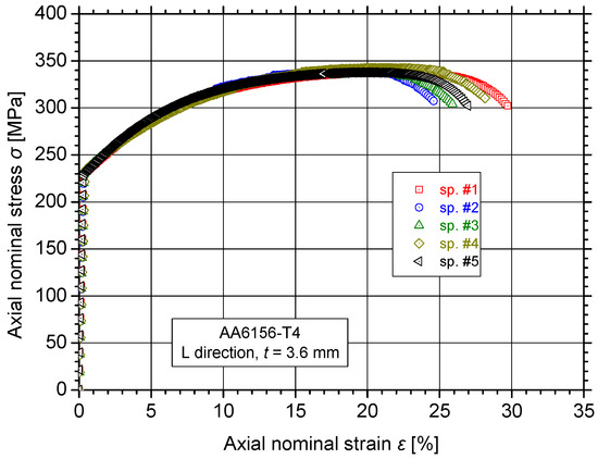 Typical five experimental tensile curves of aluminum alloy 6156 specimens at T4 condition.