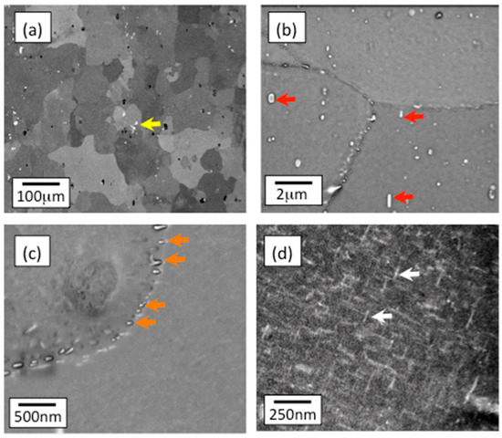 The precipitates in the OA condition are sufficiently large to be imaged in the FEG-SEM, and examples of the OA microstructure at low and high magnification are shown in Figure 6. High aspect ratio precipitates in the grain interior, with lengths up to approximately 50 nm can be seen, with precipitate free zones formed adjacent to the grain boundaries, as also noticed in [35]. Similar results have been noticed in Yin et al. [32], where the needle lengths exceeded 50 nm and lengths up to 72.5 nm were also measured. An increase in the amount of grain boundary precipitation was also observed, and examples are shown in Figure 6c. These precipitates often do not lie along the grain boundary, but instead have well-defined orientations with respect to one of the grains. Li et al. [28] reported that in the over-aging condition the Q′ precipitates increase their volume fraction and coarsen. Additionally, grain boundary precipitates also coarsen and are sparsely distributed, while several PFZs appears. Extreme OA has an impact on the broadening of the PFZs. Similar results were noticed by Tanaka and Warner [15] regarding the quaternary precipitations in AA6056 when comparing them at the PA and OA conditions. As expected, the constituents and dispersoids are unaffected by the aging process.