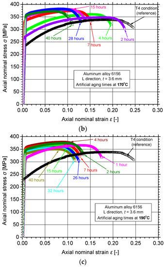 Typical experimental tensile flow curves of AA6156 specimens for different heat treatment temperatures (a) 150 °C, (b) 170 °C and (c) 190 °C.
