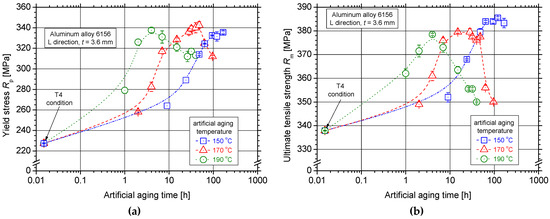 Figure 8a shows the variation of yield stress Rp for different aging times and different aging temperatures as average values along with the respective standard deviation. The non-artificially aged specimens (T4 condition) exhibited yield stress Rp = 230 MPa which increased with increasing aging time up to a maximum value; this maximum value was found to be aging-temperature-dependent. For the lower investigated temperature, this peak was not achieved and for time durations higher than 166 h the alloy is expected to slightly increase its yield stress above 340 MPa. Hence, all investigated time durations of this aging temperature were related to UA and PA conditions, since no OA signs (drop in ductility) were noticed. The tensile test results regarding artificial aging of AA6156 are very limited in the literature. Zhang et al. [11] reported that a peak in conventional yield stress Rp0.2% was noticed of around 320 MPa after aging 100 h at 150 °C. With OA conditions (1000 h at 150 °C) the conventional yield stress decreases at the minimum plateau of values of approximately 310 MPa.