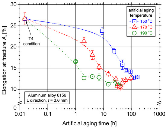 Evaluated elongation at fracture Af for the different investigated artificial aging conditions of AA6156.