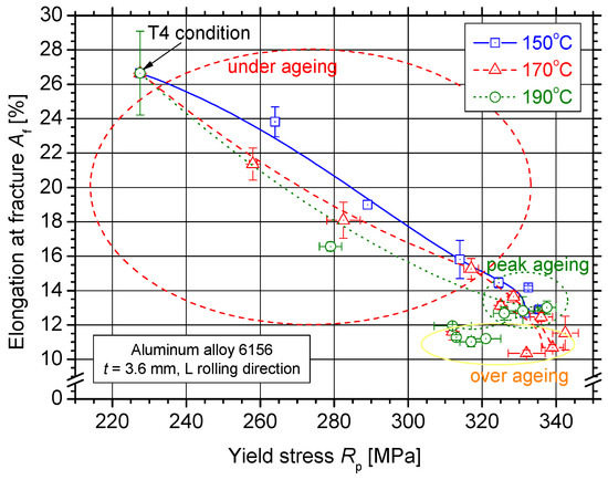 Plotting map of tensile elongation at fracture Af over yield stress Rp for the different artificial aging conditions of AA6156.