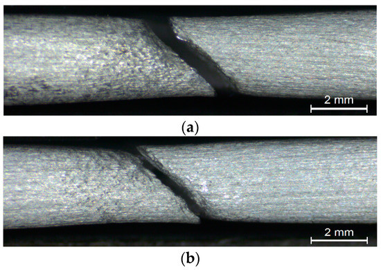 Side fracture morphologies of AA6156 tensile test samples for all the investigated aging conditions can be seen in Figure 11. As can be seen in the first three figures, the fracture mechanism is identical for the UA and PA conditions. This involves a purely ductile fracture mechanism and shear (slanted fracture) that is demonstrated by the 45° angle with the loading axis (Figure 11a–c). This kind of localization angle of 45° is characteristic of plane strain state, despite of the low thickness of 3.6 mm of the specimens. Necking occurs preferentially along the thickness direction and therefore the deformation along the transverse direction is inhibited. Therefore, plane strain conditions are applied at the center of the neck that leads to slant fracture (45° angle) with the normal to the fracture plane. Similar results were noticed by Asserin-Lebert et al. [2] for several thicknesses ranging from 1.4 to 6.0 mm as well as by Morgeneyer et al. [13] for 3.2 mm thickness.