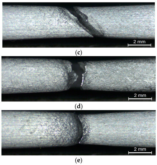 Side fracture surfaces of the tensile specimens with different artificial aging times (a) 7 h (under-aged—UA), (b) 28 h and (c) 48 h (peak-aged—PA) and finally (d) 63 h and (e) 96 h (over-aged—OA) at 170 °C.