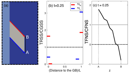 Figure 2. (a) The red (top CTB), blue (lower CTB), and black (BP) lines indicate the horizontal axes in (b,c) used by the lines in the same colors. (b) Profiles of TRSS along the upper and lower twin boundary T0 H and T0 L (Figure 1a) in the single twin embryo. The neighboring orientation is C3 (Table 2). Indicated by the red and blue arrows shown in (b), the profiles start at the GB, extend along the CTBs, and end at the CTB/PB intersection. The location of the GB and the TF are indicated by a solid and a dashed vertical line, respectively. The TRSS is normalized by the CGSS (20 MPa). The x-axis is the distance to the GB normalized by the length L of the twin embryo. (c) Profiles of TFNS (black curve) along the TF shown in (b). The TFNS values are normalized by CFNS = 40 MPa, the uniaxial stress corresponding to CGSS = 20 MPa.
