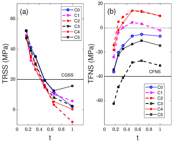 Figure 3. (a) TRSS and (b) TFNS corresponding to where the TRSS/CGSS and TFNS/CFNS reach a peak value as a function of t and for grain neighbor orientations C0–C5 in Table 2.
