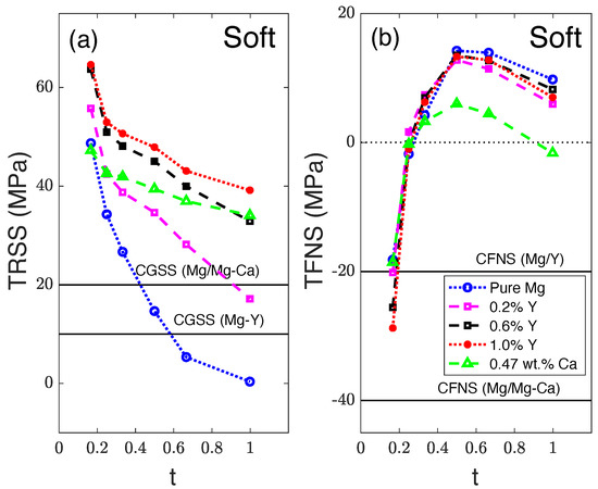 Figure 4. (a) TRSS and (b) TFNS where TRSS/CGSS and TFNS/CFNS achieve a maximum for pure Mg, Mg-Y, and Mg-Ca in C4 (“soft” neighbor). CGSS values are taken from Refs. [69,70,80].