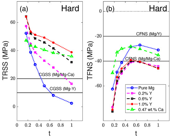 Figure 5. (a) TRSS and (b) TFNS where TRSS/CGSS and TFNS/CFNS achieve a maximum for pure Mg, Mg-Y, and Mg-Ca in C3 (“hard” neighbor). CGSS values are taken from Refs. [69,70,80].