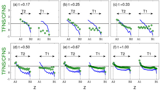 Figure 6 considers two closely spaced embryos, s = 0.5 , and studies the effect of their thickness t, by varying t from 0.17 to 1, on the TFNS. For comparison, the TRSS/CGSS profile for the single embryo with the same t in each case is included. The striking results are the asymmetry and suppression for propagation relative to the isolated embryo. For the range of t, the lower twin (T2) has the higher peak TFNS/CFNS than upper one (T1) and it occurs at its bottom CTB/PB intersection. The interactions between the embryos cause the lower twin (T2) to become more likely to propagate forward relative to the upper one (T1). Their differences reduce as t increases above 0.7 and their TFNS distributions are nearly equal when the embryos are equiaxed.