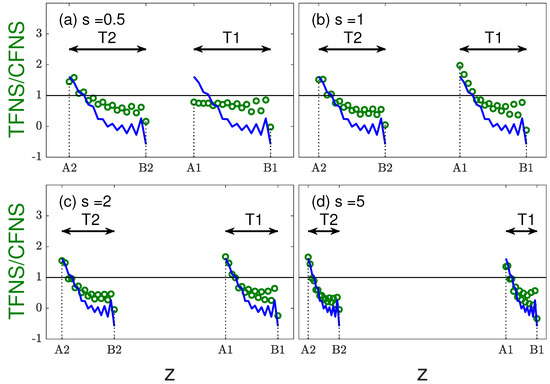 The effects of their strong interactions on the TFNS are expected to decrease as s increases from 0.5. Figure 7 investigates the influence of s on the TFNS/CFNS distributions along the PB front, for a pair of moderately thin embryos t = 0.5 by increasing their s from 0.5 to 5. To elucidate the effect of their paired interaction, the TFNS/CFNS profile of the single embryo with the same t = 0.5 is overlaid on each profile. The important result to note is that for s 1 , the TFNS/CFNS ratio reaches a peak at the CTB/PB intersection on the PB front of both twins. The upper twin T1 has the slightly higher peak. As their s increases (approaching just two times their thickness in this particular case), their profiles become similar. As expected, when s increases even further, the distributions approach that of the single embryo although within the range of s studied, do not achieve it.